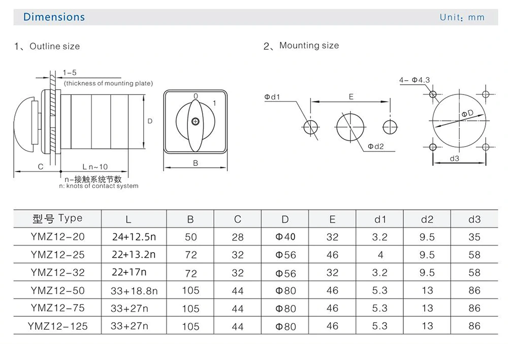 125A থ্রি পজিশন কম্বিনেশন রোটারি ক্যাম সুইচ LW31 (অভ্যন্তরীণ মডেল: YMZ12-125) 50 Hz AC বৈদ্যুতিক সিস্টেমের জন্য ডিজাইন করা হয়েছে, যার রেট করা হয়েছে 690V AC এবং 240V DC পর্যন্ত ভোল্টেজ এবং 125A পর্যন্ত রেট করা বর্তমান।
