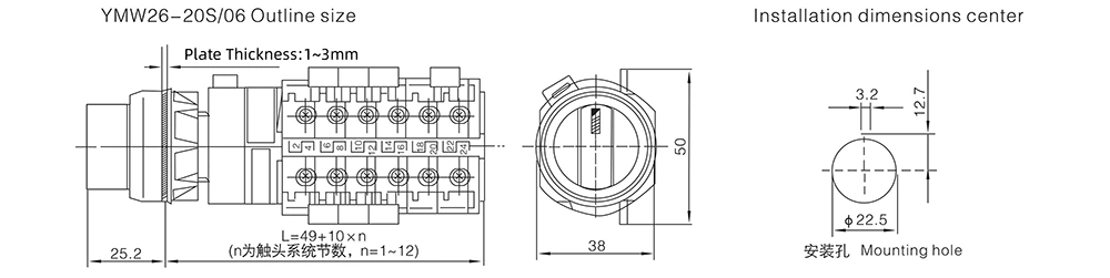 20A সিঙ্গেল হোল সেন্টার মাউন্টিং ক্যাম সুইচ হল ইয়ামিং-এর বছরের প্রযুক্তিগত উদ্ভাবন এবং উত্পাদন দক্ষতার স্ফটিককরণ। একটি মৌলিক ঘূর্ণমান গাঁট সুইচের বাইরে, এটি বিজোড় এবং নির্ভরযোগ্য সার্কিট নিয়ন্ত্রণ এবং রূপান্তর অর্জনের জন্য প্রকৌশলী, শিল্প নিয়ন্ত্রণ দক্ষতা এবং সরঞ্জাম কর্মক্ষমতা উন্নত করার জন্য একটি মূল উপাদান হিসাবে পরিবেশন করে। সুইচটি 22.5 মিমি অ্যাপারচার সহ একটি সেন্টার হোল ইনস্টলেশন ডিজাইন গ্রহণ করে, যা বিভিন্ন সরঞ্জাম প্যানেলে দ্রুত এবং সুবিধাজনক সমাবেশের সুবিধা দেয়।