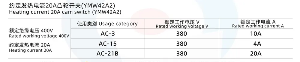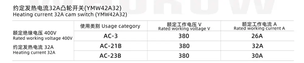 - 32A ক্যাম সুইচ: 20A মডেল হিসাবে 30°, 45°, 60°, 90° একই পজিশনিং কোণ গ্রহণ করে, সর্বোচ্চ 12টি অপারেশন পজিশন এবং 1-12টি সুইচ স্তর সহ। এটি শক্তিশালী বর্তমান-বহন ক্ষমতা আছে, উচ্চ শক্তি প্রয়োজনীয়তা সঙ্গে অনুষ্ঠানের জন্য উপযুক্ত.